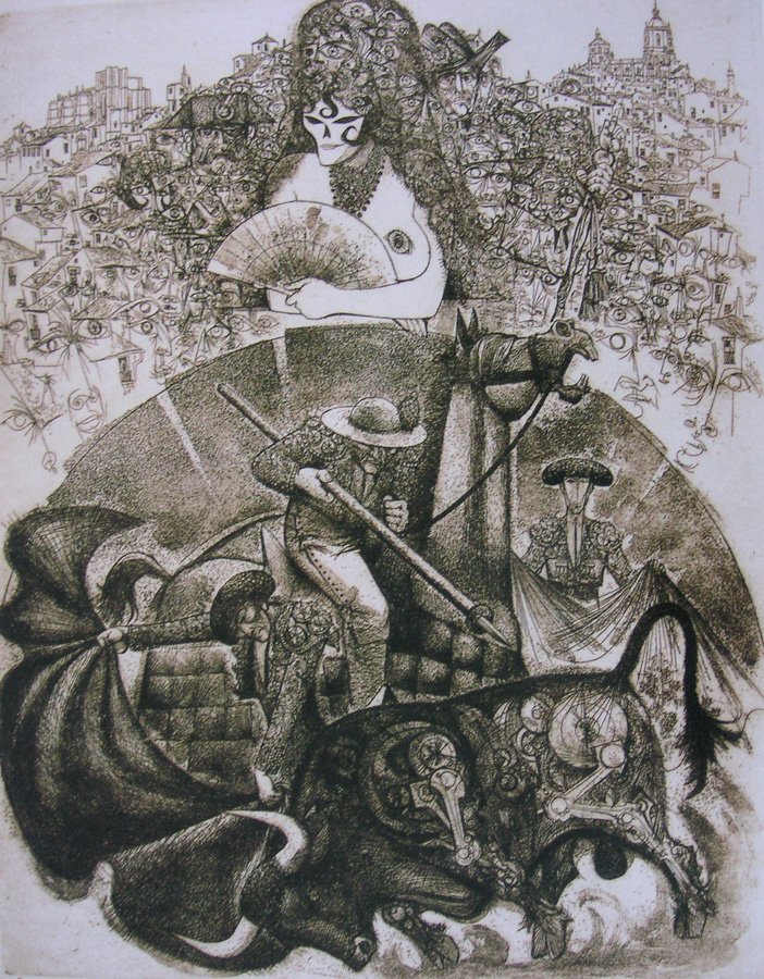 El abanico de la maja es el redondel –oro y sombra– donde triunfa o muere el torero cada tarde. Se emperifolla la dama, a su diestra el tricornio de bigotes y flanqueada de público acezante, ávido de la sangre que se verterá en la arena, con el cruel paisaje de España eterna al fondo. El de la garrocha debilita el empuje del cornúpeta, enjambre de músculos y huesos, mortífero y mecánico engranaje, que se precipita como un huracán hacia el capote, buscando el vientre del torero, que es un vientre inerme de recién nacido, con su cordón umbilical aún palpitante. Relincha el caballo, intuyendo la muerte sobre sus flancos, y múltiples ojos aterrados, desprendidos de su complemento orgánico, convergen sobre el insólito espectáculo. ¡Ha de haber una muerte y tiene que ser pronto! La mujer prefigura la agonía y aquí, en este trance, es anuncio y solemne augurio de que habrá un títere de luces tendido horizontal sobre la plaza. Relinchará el caballo, eviscerado a través del peto protector, se sobrecogerá el entendido en la barrera y reirá la maja de peineta, indiferente a un dolor sincero, anónimo, el único en todo el graderío que prolongará sus lágrimas más allá de la tarde colorista y trágica. La muerte se ceba en su víctima entallada, graneada de piedras que son el reverso de los luceros que salpicarán el firmamento por la noche, mientras el cadáver, con un rictus de pudor y de inocencia, ve tremolar sobre su rostro la palidez amarilla de las velas. La mujer de peineta es la tentación del maletilla, que se creyó hombre al recibir la alternativa, cuando no era más que la víctima inocente que necesita asesinar la muchedumbre.