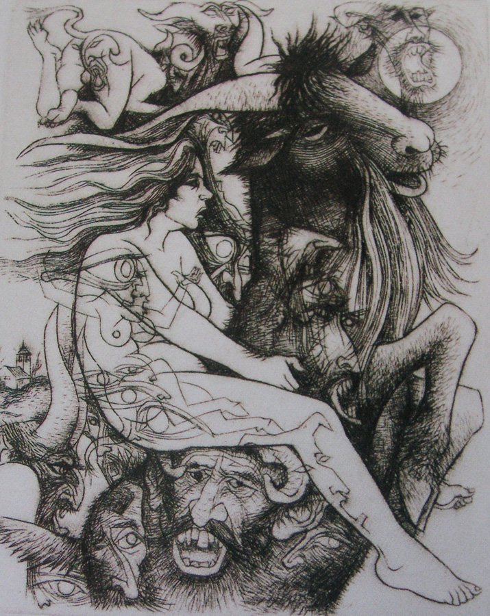El hombre es animal que rapta a la doncella, cuyo temblor no le impide aferrarse a su pelaje.