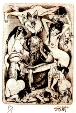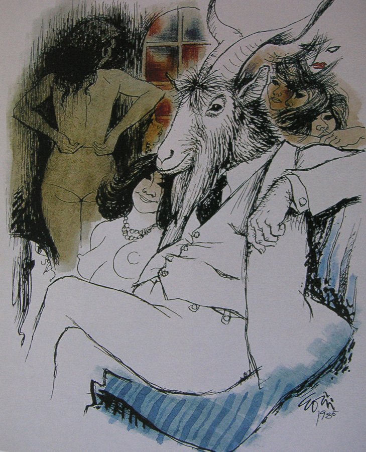 El cabrón, saciado y satisfecho. Buen pagador, señorea el lupanar, que se diría su casa. Todas le sirven.