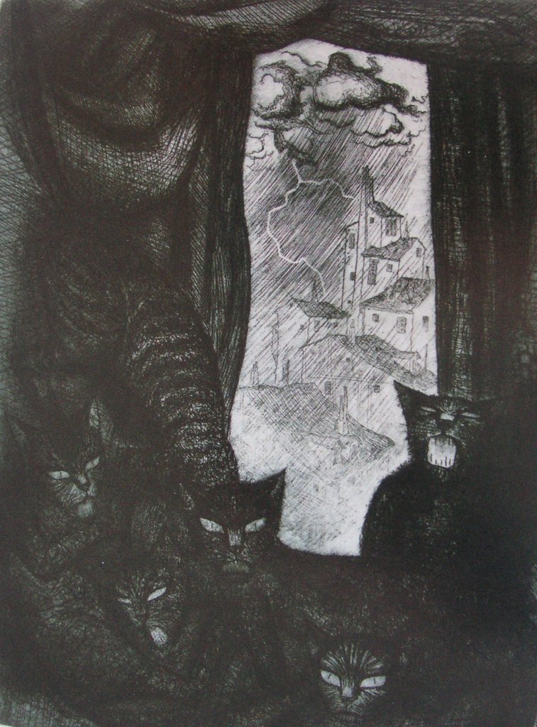 Las pesadillas habitadas pueden ser de varias clases: con quimeras o tarascas, diablos con rabo, cuernos y tridente que parecen salidos de la guardarropía de un teatro, perros como el espurio y mítico de Baskerville, vampiros bajo la luna o en su cripta, rompecabezas absurdos y figuras geométricas gobernadas por leyes imposibles, que destruyen el paraguas protector de la razón. En algunas, aparecen gatos y son la evidencia de un desarreglo fisiológico, de una pesada digestión de grasas y licores, de un festín, cotidiano o tal vez excepcional, que degeneró en glotonería. Suelen ocurrir de sobremesa, descabezando un sueño ahíto de comida, mientras afuera, en la tarde encapotada, descarga la tormenta con relámpagos y truenos, prestando su efecto de terror a los durmientes. ¿La tormenta pertenece al sueño o es real? No se sabe y tampoco importa, componiendo el fondo pintado de la angustia. Las pesadillas con gatos equivalen a la factura onerosa con que, a lo largo de la tarde, se paga el doméstico menú que se comenzó a servir con ligereza y terminó produciendo ardor de estómago. Se fueron ya los invitados; o quizá, como el anfitrión, recordando los pecios desechados por el mar, tributen igualmente sus excesos, arrojados en divanes, canapés, en el propio suelo que cubre desgastada alfombra. Los gatos se quisieron refugiar de la tormenta y entraron en el tabuco del durmiente, agazapándose a sus pies.
