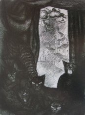 Miraron fiero y maullaron, censurando la demasía del bulímico: éste rezongó y siguió durmiendo. Rugió la tempestad y los gatos se apretaron entre sí. Por encima de los tejados, más allá de las nubes, quería venir la noche. Pero la noche es ideal para el descanso y aquí no se trata de descanso, sino de trasudar lo que se ingirió con gula, refiriendo anécdotas procaces, acompañadas de groseras carcajadas. La pesadilla, no obstante, tiene su aquél de belleza y armonía, como todo lo que ocurre bajo el dominio de lo onírico, así se haya originado torpemente. Los gatos, que fueron adorados en el país del Nilo, co nservan en la pesadilla su aura sagrada, que les convierte en demonios familiares de los que dicen las leyendas que cumplen los cándidos deseos de sus dueños. Aquí están deseando hacer su parte, por eso aguardan y por eso se impacientan. Ruge la tormenta, la lluvia flagela con sus mínimos hilos los tejados y el viento sacude las cortinas. El dispéptico, con sus compañeros del banquete tirados como él sobre la alfombra, se revuelve pesadamente, queriendo despertarse y sin poder diferenciar vigilia y sueño.