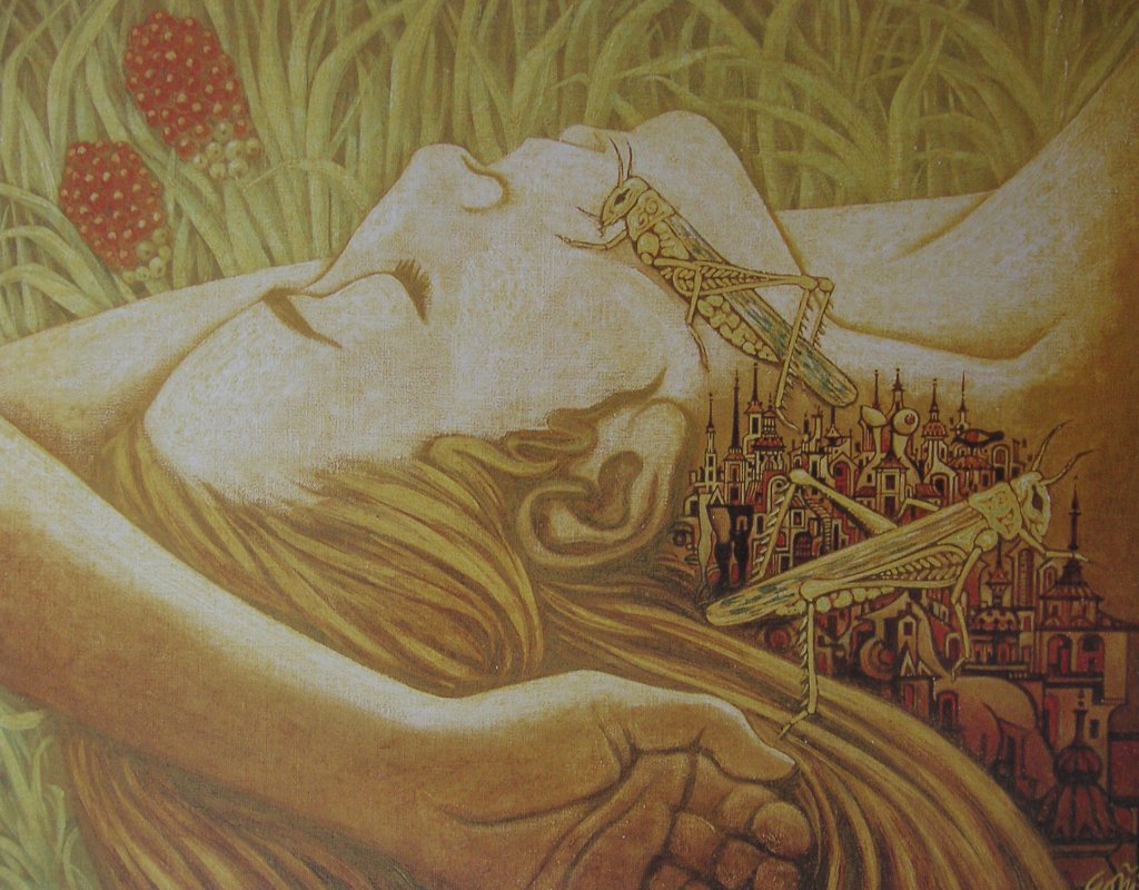 Cuando duerme la mujer –en este caso se llama Rosalía–, surge en la calígine del sueño una ciudad con minaretes y con cúpulas. ¡Ciudad sagrada y misteriosa, cuajada de pasadizos y ventanas, donde la huella de la mujer se evoca en cada esquina! El sol dora las agujas de sus torres, elevándose en un cielo intemporal. Esta urbe escondida es el refugio de la astuta Scherezada, que subyugara con cuentos al tirano. Miente Rosalía como mentía aquella embaucadora. Tiene que hacerlo porque su vida está en peligro. Rosalía –algunos la llaman Scherezada– duerme sobre colchón de agrestes hierbas, bajo la centinela de langostas que son el espíritu del sueño. El sereno latido de su pecho acompasa su inconsciencia. Se alejó de la casa. Buscó para desperezarse un lugar tibio de fronda en el que desplegar su fantasía. La llaman y no escucha: ¡Rosalía...! ¿Dónde se esconde esta muchacha? ¡Rosalía...! Las voces se difuminan en la tarde. Toma cuerpo la ciudad que pronto se llenará de pobladores y será escenario de int rigas y pasiones, de amores desdichados que provocarán crueles venganzas. Scherezada –algunos la llaman Rosalía– retomará cada noche ante el califa el hilo incesante de su historia, poblándolo de genios, camelleros, comerciantes, de mágicos ladrones, de alfombras voladoras y traidores de nariz aguileña en los palacios... Esos palacios que ella ha construido y en cuyos patios la risa cantarina de las fuentes se entrevera con el sollozo de los amantes clandestinos sorprendidos en su abrazo. Sale una cimitarra de su funda. Esto Rosalía no lo quiere. Pero su imaginación es tan potente como el río que corre subterráneo bajo el pálido desierto. La arena embeberá en un santiamén la sangre. El alfanje, vestido de rojo, volverá a su embocadura. Rosalía, llegado este punto, se quiere despertar: ha ido muy lejos. Es lo que tienen las ciudades orientales: su seducción y su embrujo cuestan caros.