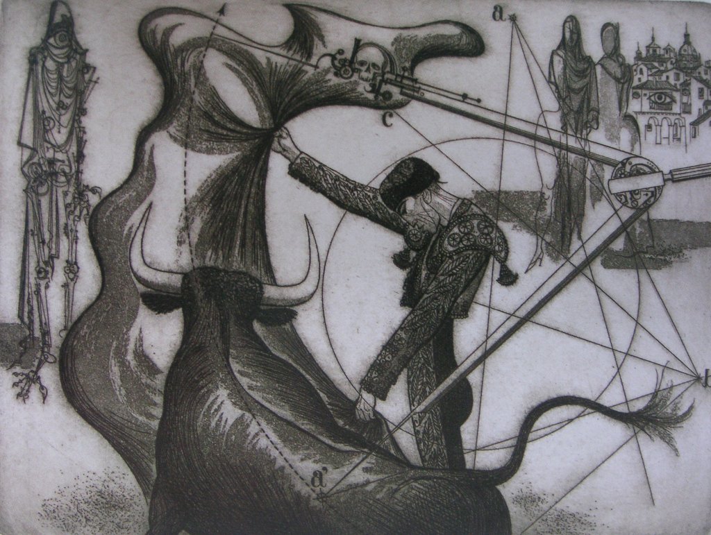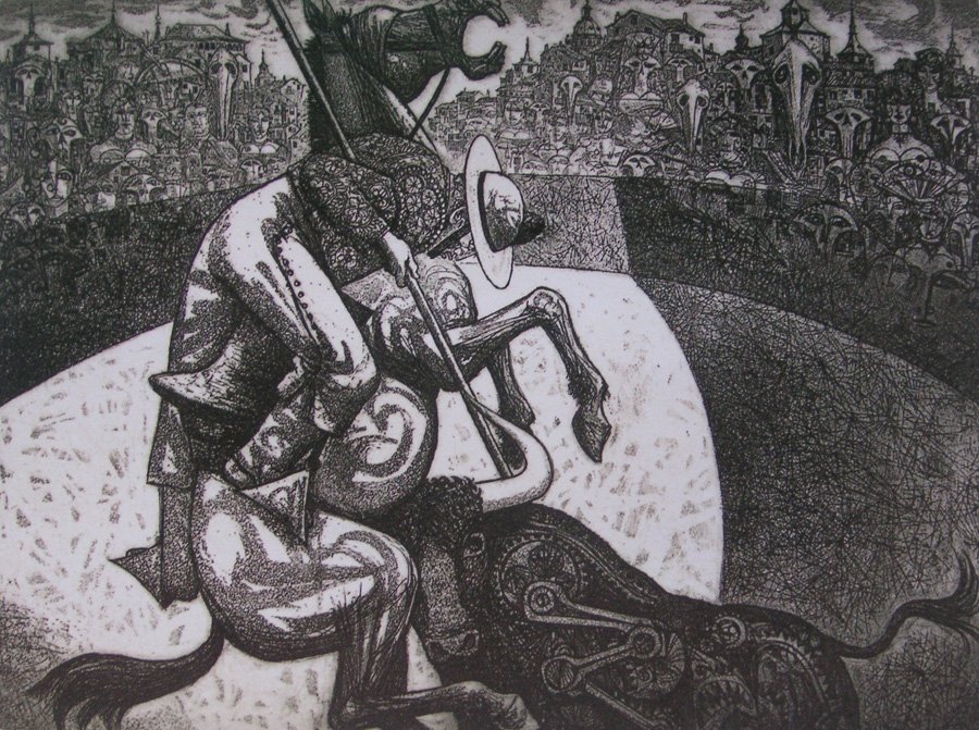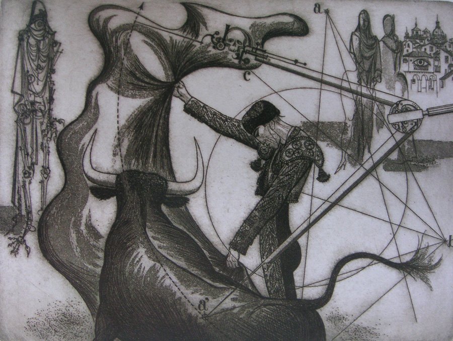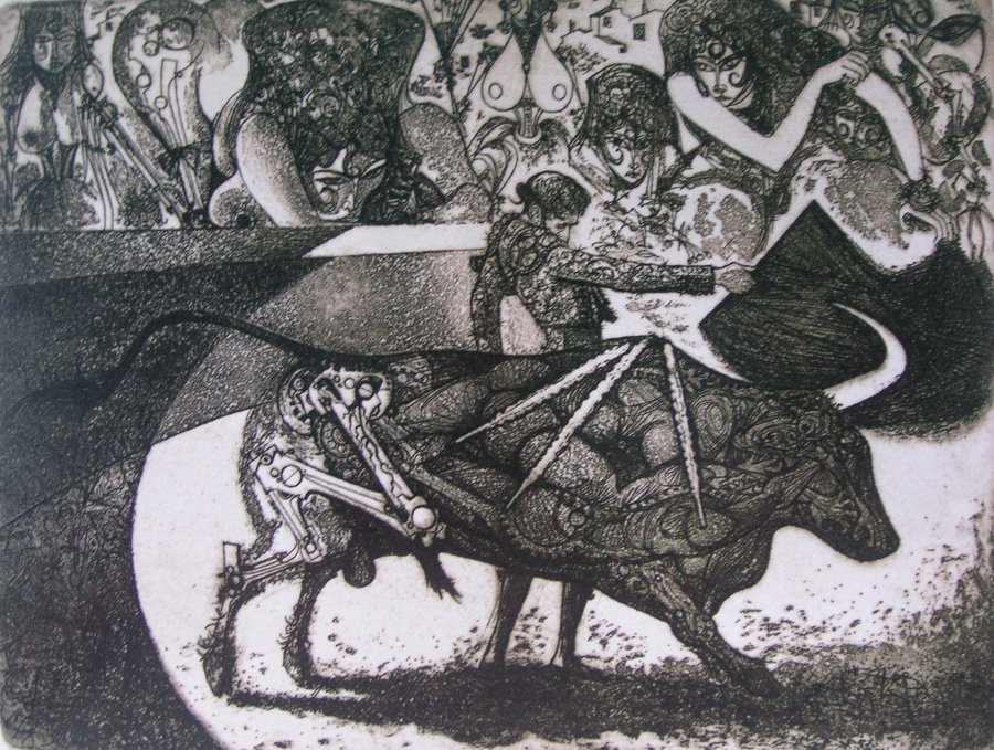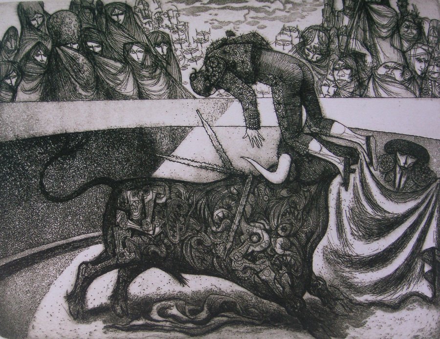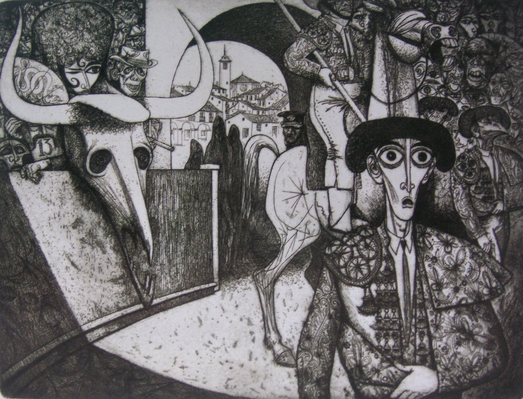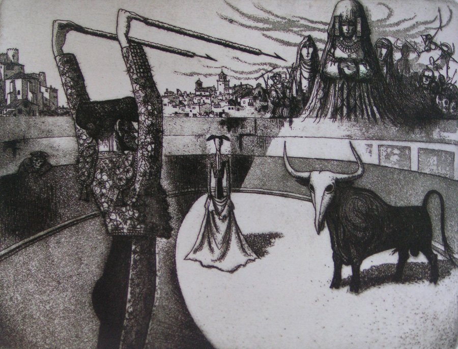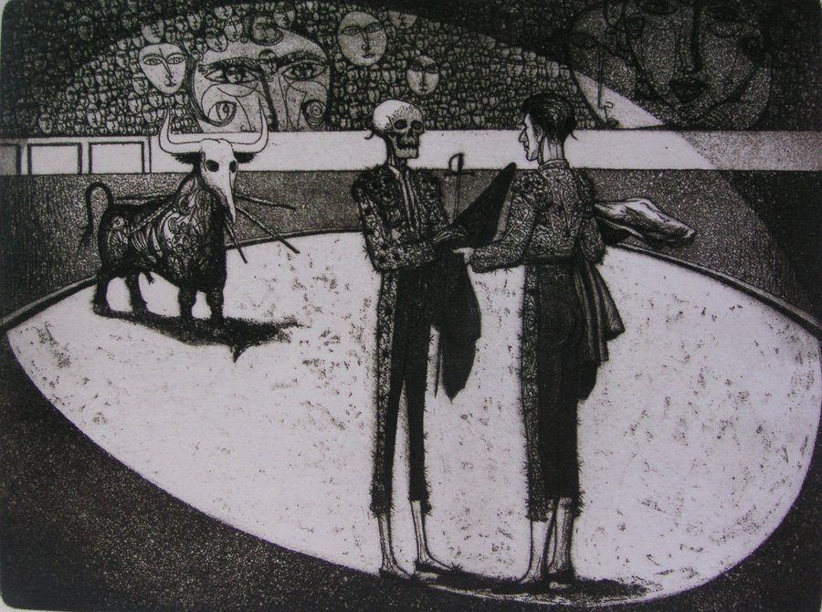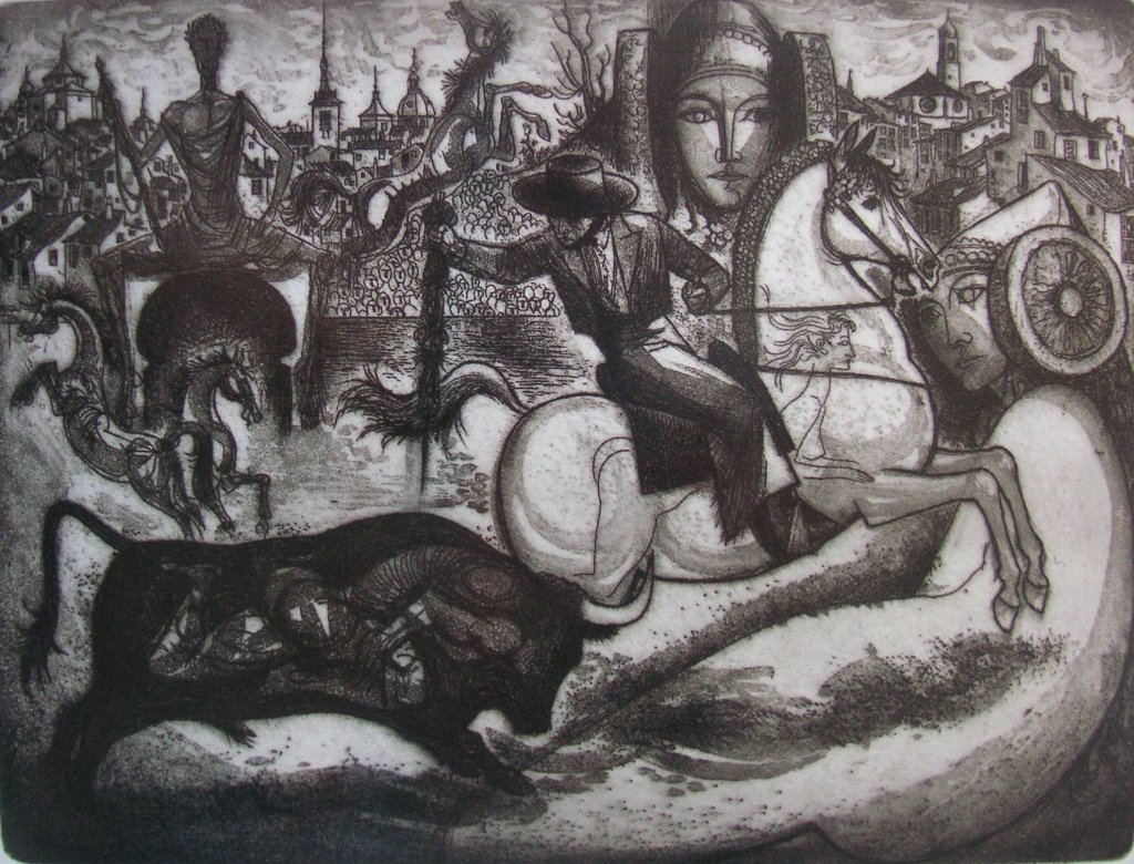 ¡La fiesta comienza con rejones! Toro, caballo y caballero, de perfil. Acentos griegos sobre fondo de tejados españoles. La Muerte, coqueta, se disimula con afeites.