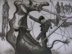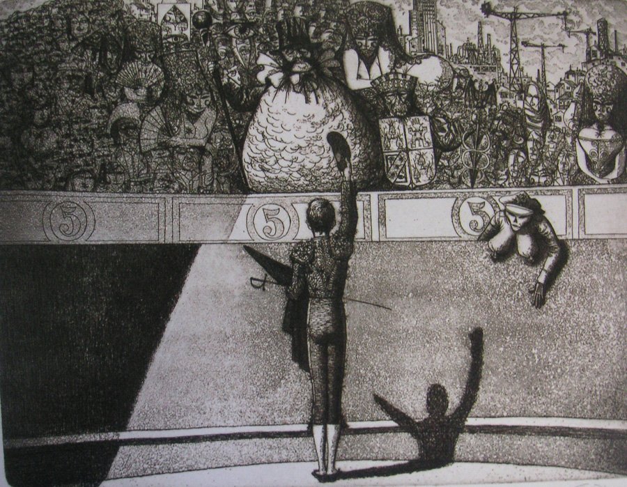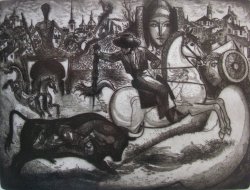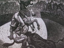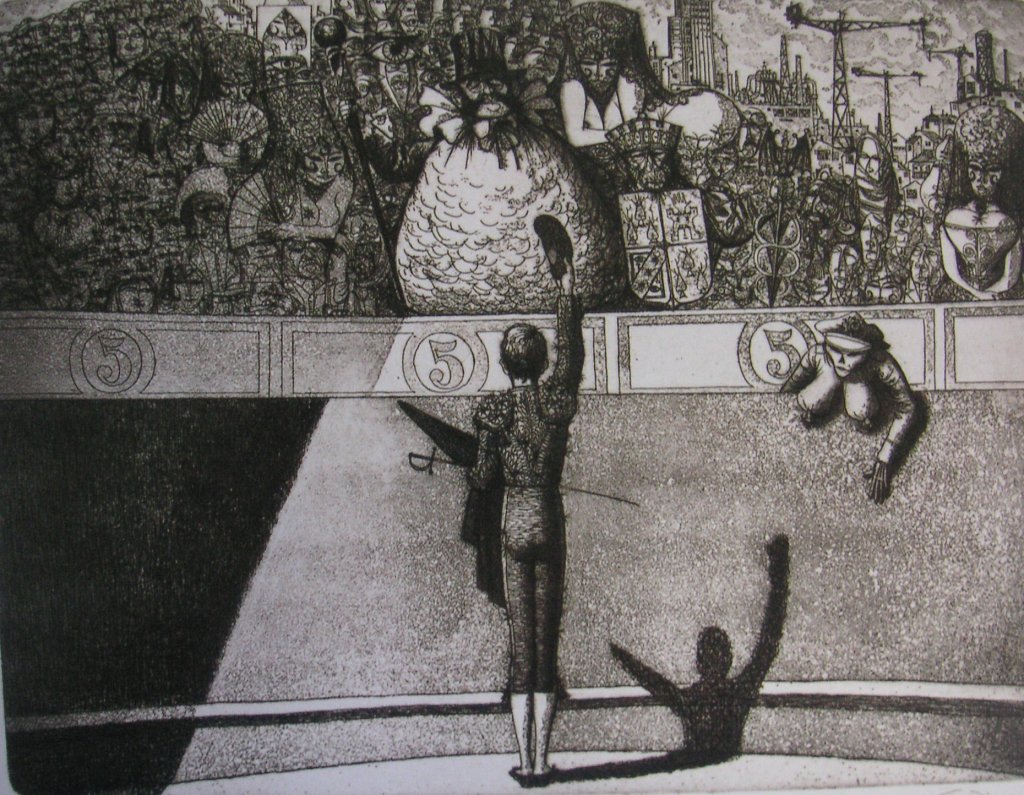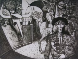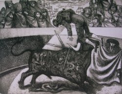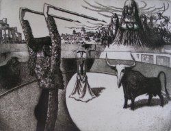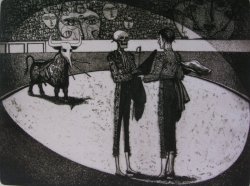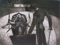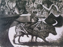 Un artista español termina por hacer su Tauromaquia. Porque, si no, no es artista ni es nada. Aquí tenemos a Goñi con 13 estampas -la Portada, una escueta joya de menor tamaño que el resto de la serie-, donde muestra la metáfora del Ruedo Ibérico Nacional, que arranca de feroz e irremediable añoranza por la Muerte y termina con ésta pisando con elegancia sobre el torero exánime –habría que decir el español.