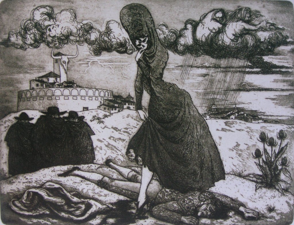 Pero enseguida vuelve a guiñar desde el tendido. ¡El número trece, la serpiente y muchedumbre de canallas! Los ojos del torero se desorbitan en sus cuencas. ¿Daría marcha atrás...? Todos empujan. Tres siluetas negras, y, al fondo, tras el arco, un campanario.